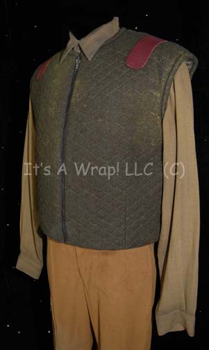 Description: A costume featured in Star Trek VIII: First Contact for wear by Brent Spiner in his portrayal of “Data”. The costume is a set of suede mustard colored trousers with black nylon suspenders and a matching belt, a mustard colored long sleeved button front shirt with a fine black zigzag pattern, a green colored zip front wool vest with brown leather shoulder accents, and a pair of brown leather ‘New Rock’ brand name boots with laces and straps. The vest and trousers feature sewn in Western Costume Co. tags reading ‘Brent Spiner’, the shirt was located with the lot, the boots feature interior labels reading ‘Data’, and a costumer’s tag reads ‘Data 21st Century’. The seams on the ribs on both sides of the shirt have minor tears or purposeful unstitching measuring 1-1.5 inches.