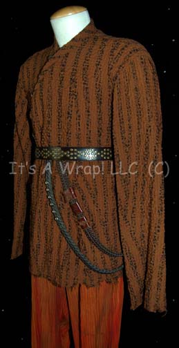 Description: A costume featured in the Star Trek: Enterprise episode and part of the three part “Syrrannite” story arc, “The Forge”; wherein costume consists of a lightly distressed, long-sleeved, brown shirt featuring black stripes, a textured, square pattern all long the garment, large, accessory buttons down the front and a wrap-around front that hides the real buttons underneath. Included are rust-colored, overall-style trousers with a vertical, bunched design and a metal-studded, leather belt featuring braided leather accents. A sewn in Enterprise tag reads ‘Jeff Doba 083’.