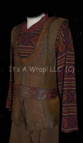 Description: A costume featured in various episodes of Star Trek: Voyager. This costume consists of a long-sleeved sweater in an earth-toned southwestern design, a vest of different types and textures of distressed leather stitched together with leather cord, a matching belt that attaches to the vest via Velcro, and brown, overall-style trousers with staggered, black stripes. All three items feature sewn in Voyager tags that read ‘7th season, Robert Beltran #1’.
