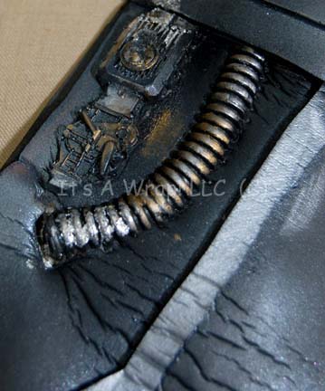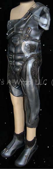 Description: A costume duplicate for a stunt double or stand in featured in the Star Trek: Voyager episode "Collective"; wherein “Voyager” finds a Borg cube controlled by children who have been separated from the Collective. This costume has black and grey molded-rubber, “circuitry” and accents sewn onto an overall-style jumpsuit that covers the lower abdomen and part of the left leg and another similar piece of the same molded-rubber that goes across the chest; both items zip up the back and include matching shoes. A sewn in Voyager tag reads ‘Matthew Kennedy' while the costumer's tag reads '#235 Voyager Collective, Borg Twin Boy Dbl, Nathan Kennedy'.