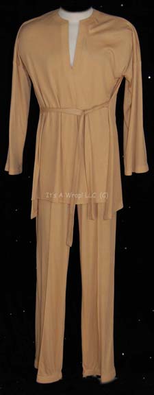 Description: A costume element featured in various Star Trek feature films. A tan ‘off-duty’ blouse worn by Starfleet crew members; light t-shirt like material comprised of pants and a long sleeve blouse with a low cut neck and a waist tie.