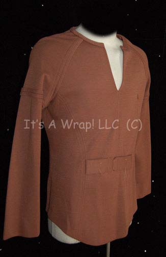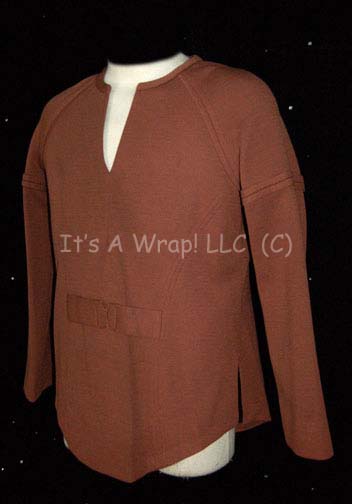 Description: A brown, Class-A, Starfleet uniform featured in Star Trek I: The Motion Picture. The costume consists of brown trousers with a brown uniform top. The lot comes with these unattached items; a bio-monitor, Science Orange shoulder division strips with a gold triangle denoting the non-commissioned rank of “Petty Officer” and a white backed Epsilon IX assignment patch indicating the wearer to be a member of the science division. The costume is intended for male wearers.
