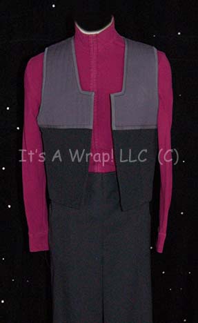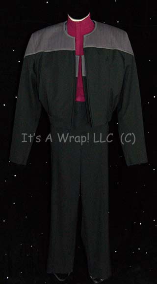Description: A costume similar to those featured in Star Trek: Deep Space Nine and the eighth Star Trek feature film “First Contact”. This costume consists of long-sleeved, black uniform jacket featuring blue/gray quilting on the shoulders, unhemmed sleeve cuffs with the Command Red division strips unattached but included, and no zip down the front. A vest of the same design and materials but with the sewn in tag ripped out of the lining and likewise no zip down the front; black uniform trousers, a long-sleeved, Command Red undershirt that snaps at the neck and zips down the front, and black, leather ankle boots. The jacket has two blank, sewn in Voyager tags, the tag in the vest has been torn out leaving a torn place in the lining, and there is a tag of the style used in “Insurrection” and “Nemesis” in the undershirt that reads ‘Mike Digiacinto, 11-01, 38’.