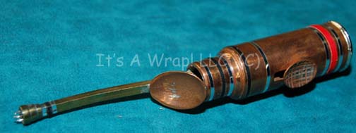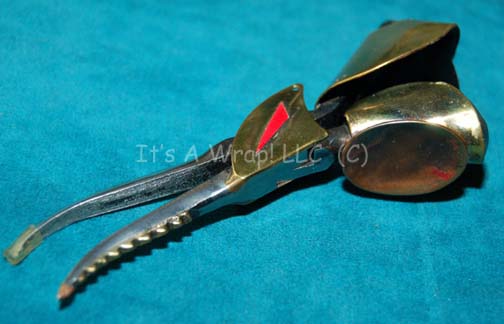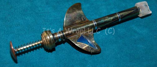 Description: A set of three specialized metal prop medical implements created for Star Trek IX: Insurrection, one being the tool used to replace a tooth in the mouth of a Son’a crewman. The items are made from metal, feature moving parts, and multiple accents. One item features a grasping claw that slides out form its position, another is a gripping loop, and another is a set of pincers, actually screen used. They measure approx. 6 X 1 inch diameter, 5 X 1 X 0.25 inches, and 4 X 2 X 1 inches. They were located in a name brand flashlight box with a label reading ‘Hero Tooth Tool.