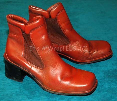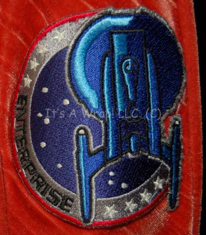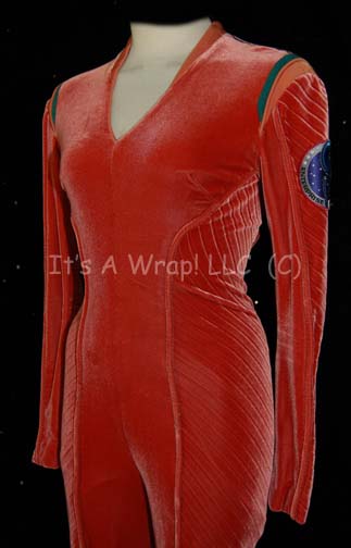 Description: A costume featured in various episodes of Star Trek: Enterprise but altered for use in “Twilight”. This costume is a long-sleeved, full-length, orange velvet jumpsuit featuring loose pleated detail down the sides and inner sleeves; an “Enterprise NX-01” patch on the left shoulder, blue green stripes around the shoulders, matching, leather ankle boots, and two holsters. Present is a sewn in Enterprise tag but with no name on it and a costumer’s tag that states it was originally from and altered for “Twilight”.