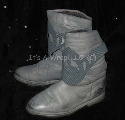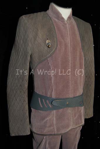 Description: A costume featured variously throughout Star Trek: Deep Space Nine episodic television. This costume consists of a long-sleeved, soft, wide-ribbed corduroy, mauve-colored jacket featuring dark-gray shoulders with a black stitched, diamond pattern, Velcro patch for a commbadge (included), an ear ring of the Bajoran-style, matching, overall-style trouser, a matching, plastic belt featuring a textured, diamond pattern, and gray, leather boots with the same textured plastic accenting them. A sewn in Deep Space Nine tag in each item reads ‘Robert Cox’ and a costumer’s tag read ‘Robert Cox, Bajoran, Gray’.