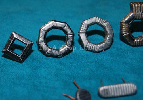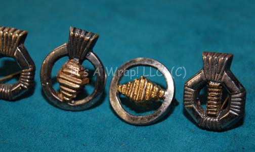 Description: An entire collection of enlisted crewman ranks like those appearing in Star Trek feature films. The ranks represented in the lot are ‘able seaman’, ‘petty officer second class’, ‘petty officer first class’, ‘chief petty officer’, ‘senior petty officer’, ‘master chief petty officer second class’ and ‘master chief petty officer’, with a commendation bar, a ‘5 year service pin’ and a ’10 year service pin’ featuring a molded Starfleet emblem. The items are all cast in silver colored metal with wire backings and occasional gold colored paint on flairs. The items are intended to be placed on the rank placements on sleeves of Starfleet crewmen costume uniforms (sold separately).