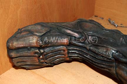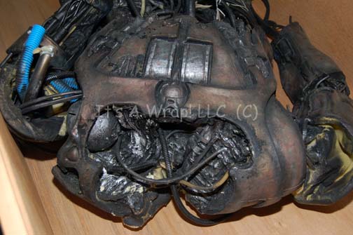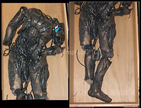 Description: A prop Borg body featured in Star Trek VII: First Contact during scenes following the release of drive plasma coolant in the “U.S.S. Enterprise-E” engineering section. The item is a molded foam rubber body composed of Borg themed ‘armor’ and a variety of tubing and wires. The item is meant to depict the remains of a body bereft of its biological components. It was located and photographed lying down in its custom wooden crate, the joints are not rigid and the item is meant to appear as a jumbled mass. One foot looks to have been removed, the item measures approx. 65 inches tall and is generally man sized.