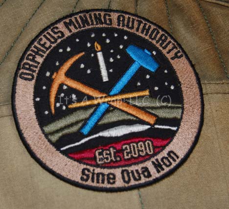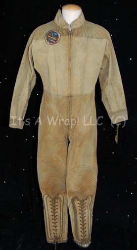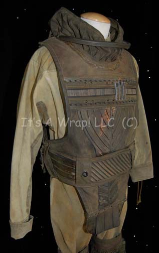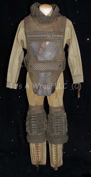 Description: A costume featured in the last TNG era feature film, Star Trek: Nemesis by a species called the Kolarans and reused in the Enterprise episodes “Terra Prime” and “Demons” as jumpsuits for the Orpheus Mining Colony on the moon. This costume consists of a long-sleeved, full-length jumpsuit in a distressed, yellowed brown color featuring diagonal quilting along the shoulders, Velcro and laced wrist cuff adjustment, a zip down the front, reinforced quilting at the knees, zipped and laced ankle cuff adjustment. Also included is a piece of heavy-duty, leather body armor featuring metal and rubber accents on the front, various straps and snaps to secure it, netting to help the wearer stay cool, and olive-green , high-topped, canvas shoes that tie and then zip up the front. For use in the Enterprise episodes, this costume had the body armor removed and added a patch under the right shoulder that reads “Orpheus Mining Colony, Est. 2090, Sine Qua Non”. A sewn in Enterprise tag reads ‘Dave Anderson, #96’.