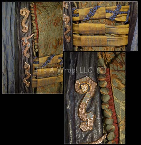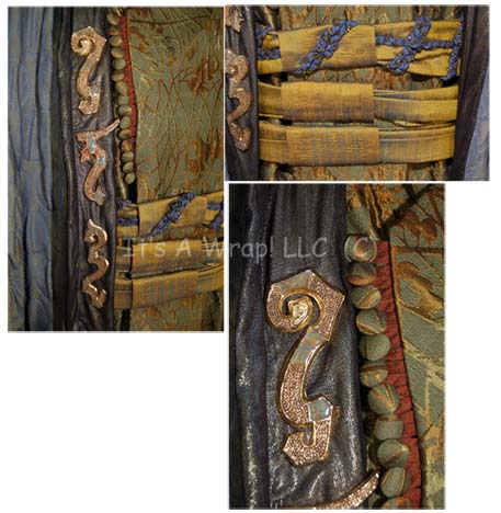 Description: A costume featured partially in the Star Trek: Enterprise episode “Terra Prime” and “Shadows of P’jem”. This lot consists of a long-sleeved, full-length, olive-colored robe featuring a beautiful textured, metallic-bronze and gold floral design, matching cloth button and button loops down the front and along the sleeve cuffs; snaps on the front for a pleated, iridescent olive-colored belt/wrap featuring blue and gold-colored knotted fabric. The outer robe is a masterpiece in and of itself; a long-sleeved, full-length robe in the style of the Asian kimono that either looks like an iridescent slate-gray/blue or an iridescent, light, metallic gold color depending on how the light hits it. A quilted circular pattern dominates the outer portion of the robe, a dark, metallic-gold hood, trim, and lining, and gold-colored, bejeweled, metal Vulcan iconographic symbols down the lapel front. The under robe was featured in the episode “Terra Prime” with a different over robe and features a sewn in Enterprise tag that reads ‘Gary Graham’. The outer robe was featured in the episode “Shadows of P’jem” with a different under robe and includes a costumer’s tag that reads ‘Enterprise, Soval, Gary Graham’ and goes on to describe all three parts of the costume that itself suggests that all three parts were worn together in another episode.