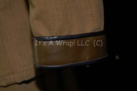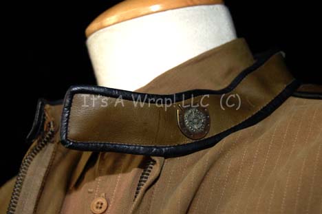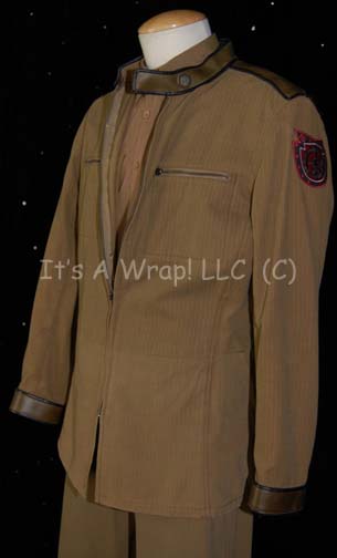 Description: A costume featured in the Star Trek: Enterprise episode “The Communicator”, wherein “Malcolm Reed” (Dominic Keating) accidentally leaves his communicator behind on a planet and he and “Captain Archer” (Scott Bakula) are captured, accused of espionage. This costume was worn by “Pell” (Tim Kelleher) as the alien military officer that captures “Captain Archer” and “Malcolm Reed” and is a long-sleeved tan jacket with olive colored leather accents on the shoulders, collar and along the cuffs; patches on either shoulder that denote that planet's military, a metal colored pin on the collar, functional pockets, a zip down the front, a matching, short-sleeved, button-down shirt and corresponding trousers. A sewn in Enterprise tag in the jacket reads ‘Tim Kelleher’ and a similar tag in the other two garments reads only ‘Tim’.