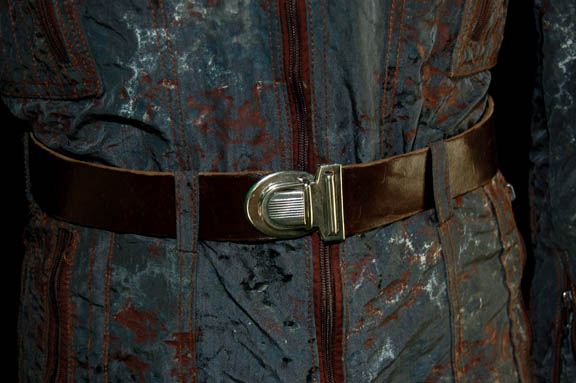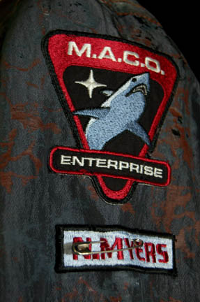 Description: A costume featured in several episodes of Star Trek: Enterprise for wear by the MACO, Military Assault Command Operations, essentially the 22nd century equivalent to the Marine Corp Special Forces. The costume is a long sleeved duty fatigue jacket of distressed urban camouflage with functioning pockets, zipper up the front, zipper/Velcro cuff adjustment, a sewn in undergarment, corresponding trousers, boots, a brown t-shirt, leather gloves and belt. The jacket includes embroidered patches with the MACO insignia, name patch for “N. Myers” on the right shoulder and rank patches of Private on the left shoulder although no one was actually referred to as “Private” on the show, just collectively as MACO’s. The assault kit contains an equipment belt, belt keeper clips, rubber cast EM-33 pistol and corresponding holster, simulated metal stun baton, one light up stun grenade (depression switch activation, flashing blue LED lights and unknown power source), one foam rubber one, foam rubber prop scanner, one compressed rubber Starfleet Energy Carbine with black nylon strap, one clip pouch for the EM-33 with three clips, and one backpack in the same urban camouflage and black nylon straps. A sewn in tag reads ‘Enterprise, Ricky Lomax’.