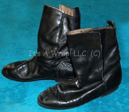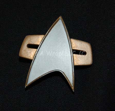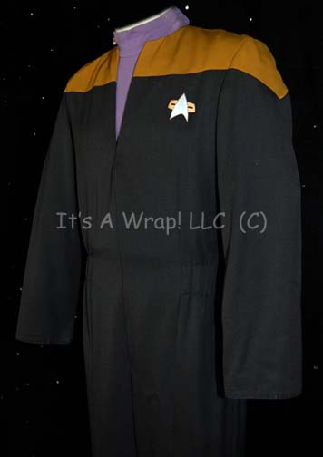 Description: A prop and costume lot featured in Star Trek VII: Generations for wear by LeVar Burton in his portrayal of “Geordi La Forge”. The costume is a Generations style Starfleet uniform jumpsuit comprised of a black form fitting jumpsuit with operations gold shoulders, an elastic interior waistband, and a plum colored long sleeved uniform undershirt with a solid collar. The costume garments feature sewn in Star Trek VII tags that read ‘LeVar Burton’ and the costume comes with a variety of associative items that were located separately of the costume. The combadge is molded resin painted metallic gold and silver with a Velcro backing to affix to the corresponding placement on the uniform jumpsuit, the rank is comprised of a three pin backing with two gold colored metal pips that have lost a degree of their fastening quality, and a third pin blackened pin, a pair of black leather shoes with inseam zips, and finally a molded rubber VISOR (Visual Instrument and Sensory Organ Replacement) painted metallic silver and gold with reflective accents at the temples and remaining double stick tape in place from set use (item is not a hero piece, presumed to be a stunt version) and measures approx. 6.5 X 4.5 X 1 inches and was located inside a black plastic box with an internally mirrored, hinged lid that measures 7 X 7 X 2 inches and depicts evidence of repair. The costumer’s tag is stamped ‘Star Trek VII’ and reads ‘Geordi Levar Burton, change #: 3 Scenes 97-178, DS9’.