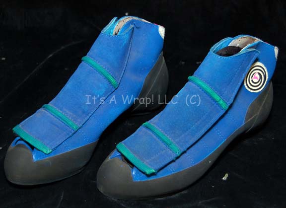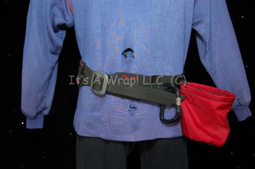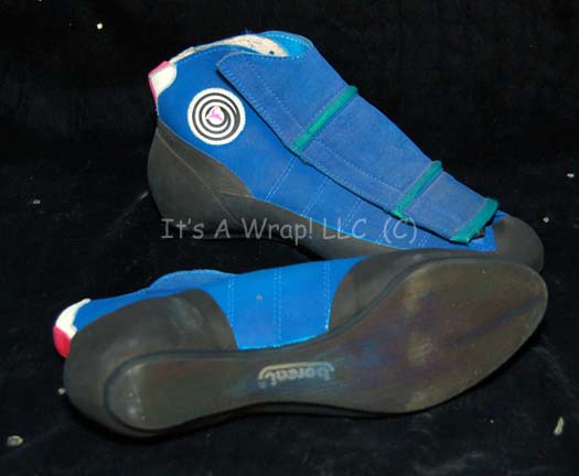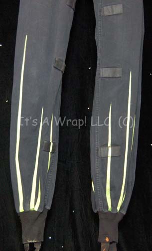 Description: A costume featured in Star Trek V: The Final Frontier for wear by William Shatner in his portrayal of “Captain Kirk”. The costume is a rock climbing outfit composed of black trousers with neon green streaks in the lower legs, an iridescent purple sweater with orange fabric accents and collar, a climbing belt with a red chalk bag and a black colored metal carabiner, and a pair of Boreal name brand climbing shoes. The sweater depicts distress, a series of holes in the belly, and a degree of non-distracting liquid stains appears in certain light, the orange fabric is decidedly darkened due to storage conditions or purposeful distress. A degree of staining exists on the trousers and a hole on the rear right calf. The climbers belt is thicker belt for attachment to the body with an affixed ring that goes around the belt allowing for equipment to hang or slide around for convenience, one stitched on element has been removed from the belt, there is no similarity to this feature on any of the other belts yet encountered in similar costumes. The items feature no sewn in tags, inscriptions, or costumer’s tags. A slight degree of light fading is present in the shoulders of the sweater, however the item retains its aesthetic appeal.