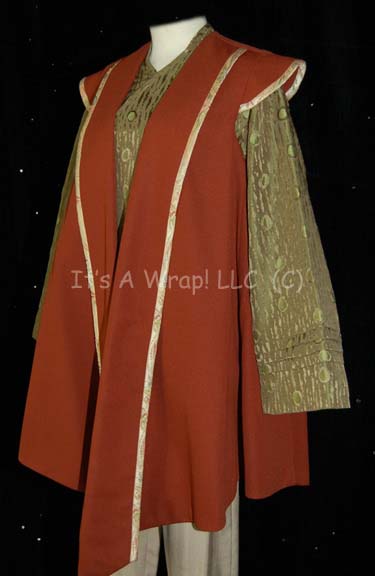 Description: A costume featured in the Star Trek: Voyager episode “Repression”; wherein “Commander Tuvok” (Tim Russ) investigates recent murders of former Maquis on board. This costume consists of a long-sleeved, green shirt featuring a reflective, vertical dash and circular pattern, beige trousers with diamond shaped cuffs and a brown sleeveless robe with a tan, floral-patterned trim. A sewn in Voyager tag in all three garments reads ‘Ron Robinson’ and a costumer’s tag reads ‘Tuvok’s Son, Ron Robinson, #251’.