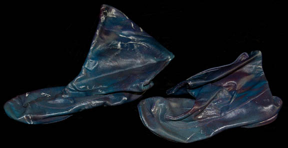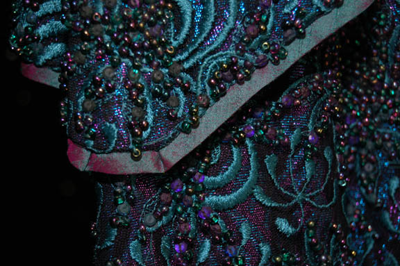Description: A costume made for Whoopi Goldberg in her portrayal of “Guinan” in Star Trek VII: Generations. The costume is a green and purple iridescent dress with intricate beadwork and flower pattern, matching trousers, forearm sleeves, and shoes. The costumer’s tag reads ‘Guinen, made for Star Trek VII, Never used’, and the sewn in Star Trek VII tags read ‘Whoopi Goldberg’.
