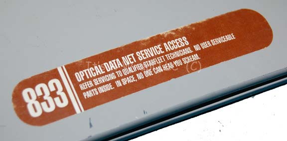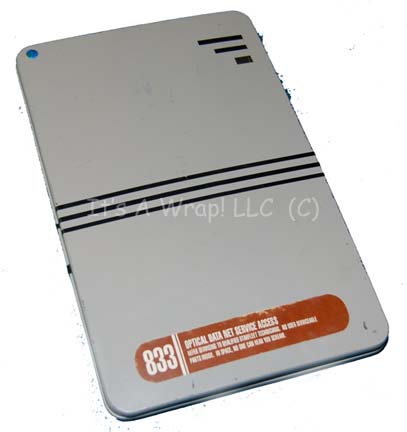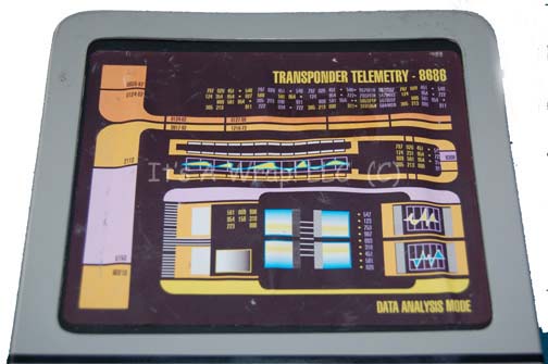 Description: A prop Starfleet style PADD (Personal Access Display Device) appearing variously in Star Trek episodic television. The item is made from multiple layers of cast resin or acrylic sheets fashioned together, painted beige. The item features a series of insets to suggest buttons and a ‘display screen’ into which is adhered a graphical application depicting an LCARS style display (Library Computer Access and Retrieval System) identified as ‘Transponder Telemetry – 8686’. The item features adhered detail lines on the reverse with a Starfleet inventory application indicating ‘Optical Data Net Service Access’. The item depicts only the slightest scratching or scuffing; the item does not lay flat as there is a bend in its overall frame, the paper based graphical application in the inset ‘display screen’ is warped, this damage is not distracting looking straight on at the item, but visible when the item lays flat. Item measures approx. 9.5 X 6 X 0.5 inches. Item Number6898
