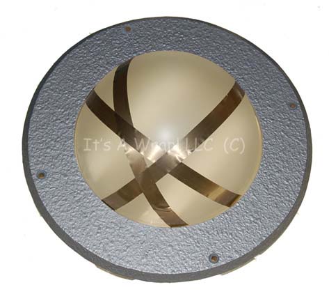 Description: A translucent plastic console dome interface featured in Star Trek episodic television. These appeared variously in episodes involving aliens such as the ‘Ferengi' and many more, sometimes as computer interfaces, and frequently as wall sconces. Usually mounted to a console or wall these items were backlit to give them a powered appearance. It features a shaped wooden ring painted metallic silver with screw holes for mounting which holds the dome in place, the dome features metallic copper adhesive accents crisscrossing. The item measures approx. 2.75 X 9.5 inches diameter.
