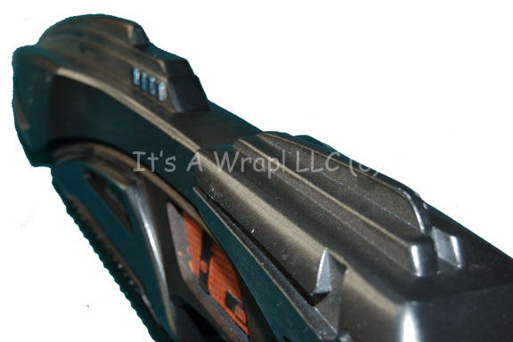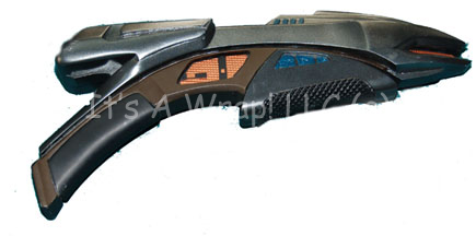 Description: A prop weapon similar to those featured throughout 24th century Star Trek episodic television. Incarnations of this item have been used in Deep Space Nine by Ferengi and in the Voyager episode “Memorial”; it is a solid cast resin, painted metallic pewter with black, metallic-copper and blue textured accents. The item measures approx. 18 X 9 X 3 inches and is in very good condition. Only slight scuffing of the paint has occurred on some of the likelier edges and rounded features.