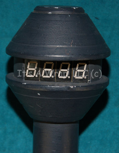 Description: A prop grenade featured in the Star Trek: Voyager episode “Macrocosm” for use by “Captain Janeway” (Kate Mulgrew) in her efforts to retake “Voyager” from a large ‘macro virus'. This prop features a series of depression buttons on the reverse with a countdown timer on the face. There is no indication of internal electronics, a screw off cap on the bottom reveals a cavity for the possibility of batteries. The item measures approx. 8 X 3.25 inches in diameter.