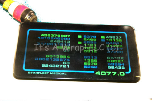 Description: A pair of smoked acrylic panels with a translucent applications depicting ‘Sickbay Sys' and ‘Patient Records Sys’ with numeric values and graphics on the longer of the two and another item of similar design depicting ‘Starfleet Medical’ with similar numeric values. The items are believed to have been made for Star Trek VII: Generations scenes taking place on board the “Enterprise-B”. Made to be mounted and backlit in a wall console these items were painstakingly removed from set pieces following set strike. The items measure approx. 20 X 4 inches and 9 X 5 inches.