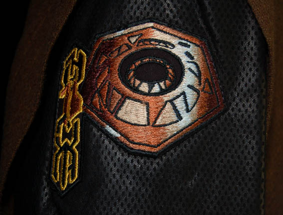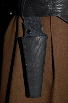Description: Captured by a massive industrial consortium and brainwashed into believing that they have been part of the employees of this company forever, the crew of “Voyager” worked under the control of the Quarren security in “Workforce, Parts I and II” of Star Trek: Voyager. A brown wool coat with black leather sleeves and collar and a zip up the front. On the sleeves are Quarren security patches one of which depicts ‘Quarren’ character letters. On the right side of the chest is a round Velcro patch. The accompanying pants are black leather as is the black belt and holster. Made by ‘MUTO Little, Los Angeles’ the costumer’s tag indicates use in the episode “Workforce”.