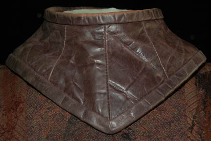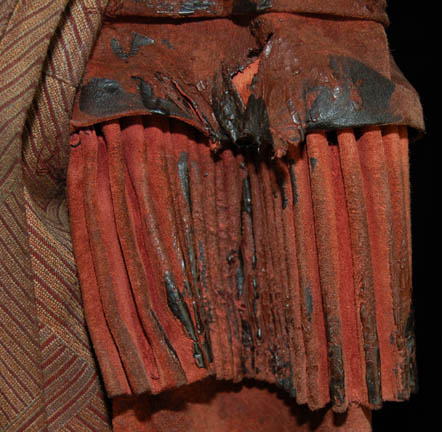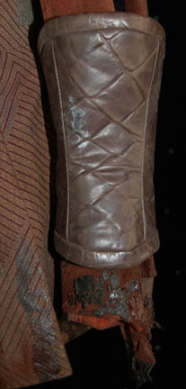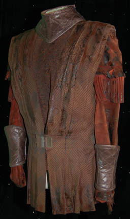 Description: A costume featured in several episodes of Star Trek: The Next Generation including “Rightful Heir”, “Birthright”, and “First Born” for wear by Michael Dorn in the role of “Lieutenant Worf”. The costume is a leather choker, two gauntlets, a rust colored shirt with pleated leather sleeves, a zip down the back, and a brown, pleated leather vest. Both the shirt and the vest s are burned and/or torn in places to appear distressed. A sewn in tag reads ‘Star Trek: TNG, Michael Dorn’ and the costumer’s tag reads ‘#242-3 Birthright, Firstborn #249 Rightful Heir, Worf, Michael Dorn’.