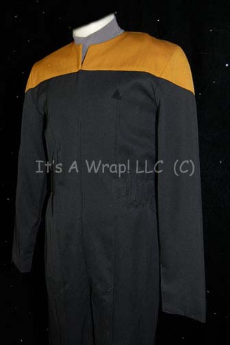 Description: A costume featured in various episodes of Star Trek: Voyager. This costume is a Voyager/earlier DS9-style Starfleet uniform consisting of a long-sleeved, full-length, black jumpsuit featuring Operations Gold division colors along the shoulders, sewn in ‘away team gear’ loops around the form-fitting waist, a Velcro patch for a commbadge (not included) on the left breast, a zip down the front, and a long-sleeved, blue/gray undershirt that has its own zip down the back. The Operations Gold coloring around the shoulders has sustained very minimal, if any, fading. A sewn in Voyager tag in the jumpsuit reads ‘Brian Hall’, a second reads ’40-198’, and a matching tag in the undershirt reads ‘Steve Dennis’.