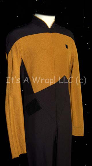 Description: A Starfleet uniform made in the style of Star Trek: The Next Generation featuring the black shoulders with a operations gold chest and back and black waist and legs that end in stirrups. This style also exhibits the Mandarin collar common to cast members during and after the third season which features gold piping along the top of the collar. This particular uniform has zips that close the front of the costume, features a Velcro patch on the left breast for a combadge (sold separately), and another on the right thigh for ‘away team gear'. A sewn in tag reads 37, #157’ denoting the size as 37.