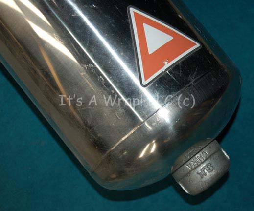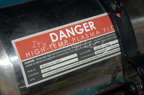 Description: A piece of set dressing featured within armory scenes in various episodes of Star Trek: Enterprise. This item is a large, polished metal, capsule-shaped “plasma container” and was part of a collection of similar containers which were affixed to a wall in the set; all able to be disconnected from their corresponding wall mounts through the use of a latch which wraps around the container. The item features a trio of graphical applications; a ‘danger’ style triangle colored red and white, two matching rectangular inventory style applications featuring red warning labels reading ‘Danger, High-Temp Plasma Flow’ with instructions about how to handle ‘exposure’, and a warning about the ‘dangerous’ elements held within. Even though the container never held anything that we know of it maintains a top mounted screw on cap which when removed reveals a closed opening, covered over with black grip tape. The item measures approx. 22.5 X 9 X 9 inches when connected.