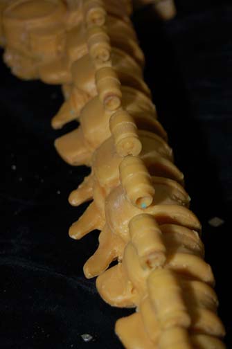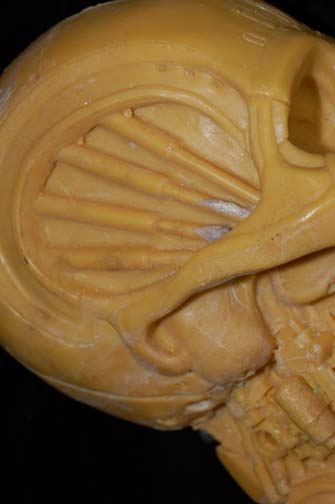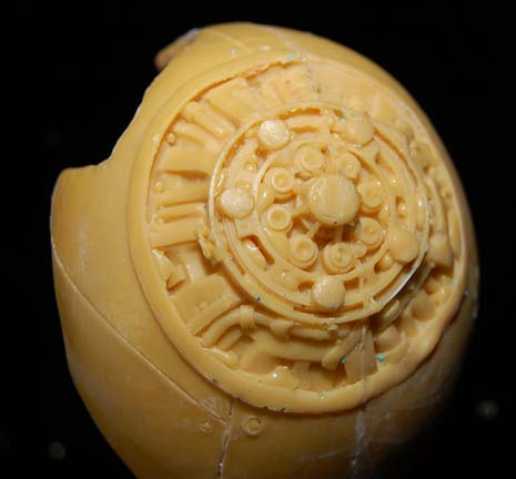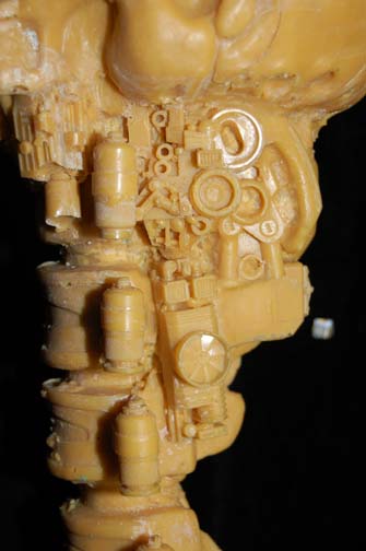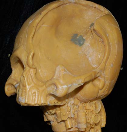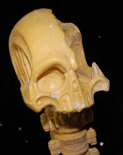 Description: A solid, yellow colored, mold of the "Borg Queen" skull and spine like the one featured in Star Trek VIII: First Contact. The item is believed to have been molded from the screen used version for possible later use as a method by which to create a duplicate. The spine is straight, the detail is excellent, and the material looks to be resin. The item depicts a skull with a large cavity cut out of the left side from the eye, around to where the ear would be and featured multiple points of detail to suggest hardware. The item measures approx. 21 X 8.5 X 5 inches.