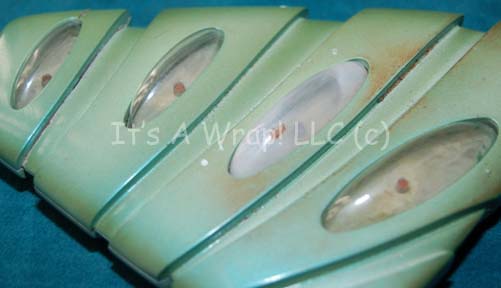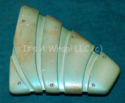 Description: A prop PADD (Personal Access Display Device) featured in the Star Trek: Enterprise episode “Unexpected”. The item is the Xyrillian device used by “Ah’Len” (Julianne Christie) to communicate with the bridge of her ship while on the holodeck with “Commander Tucker” (Connor Trinneer). The item is two pieces of molded resin made to mirror one another, screwed together. One side features opaque and clear acrylic accents that are adhered into the insets fashioned into the resin. The item is painted aqua green with an iridescent sheen and accented with a salmon colored wash. The item measures approx. 4.75 X 5.75 X 1 inches.
