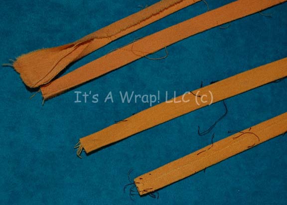 Description: A pair of fabric strips featured on the costume trousers of Starfleet uniforms in Star Trek feature films. The items are folded over and stitched sealed; meant to be sewn onto the outside seam of trousers to indicate the wearer to be a member of the operations division. The items are not the same length, one is 49 inches long, the other is 53 inches. They retain threads from removal.