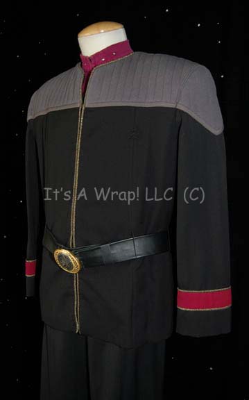 Description: A costume featured in various episodes of Star Trek: Voyager like “Inside Man” and the finale episode “Endgame. This costume is for wear by Sci-fi veteran Richard Herd as “Admiral Owen Paris”, father to “Tom Paris” (Robert Duncan McNeill); it consists of a Starfleet, First Contact-style black, uniform jacket featuring quilted blue/gray shoulders, and gold-colored accents around collar, down the front and encircling Command Red division strips on the cuffs. A Velcro patch for a commbadge (not included), and a black, vinyl belt with a gold-colored, metal buckle with the United Federation of Planets emblem on it; a long-sleeved, Command Red undershirt with two snaps on each side of the collar for rank pips (unavailable), and black uniform trousers. A sewn in tag reads ‘Voyager, Richard Herd’, and a costumer’s tag reads ‘Richard Herd, Admiral Paris, #252’.