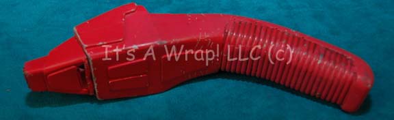 Description: A prop Starfleet Type II phaser featured in Star Trek IX: Insurrection for use by Starfleet personnel in red cloaking suits during the beginning of the movie. The item is made from sturdy molded rubber with multiple raised features, a firing button that depresses slightly, and an adhered emitter end. The emitter end depicts a degree of repair (re-adhered) and the item is painted entirely red. A series of visible cracks which are not unusual to molded rubber hand props run along the curvature of the hand grip, and around many of the raised edges. The item is unique in its coloration and retains its value for its specific use. The item measures approx. 8 X 2 X 2 inches. The item is rigid, bends slightly when attempted, and gives minimally when pressed.