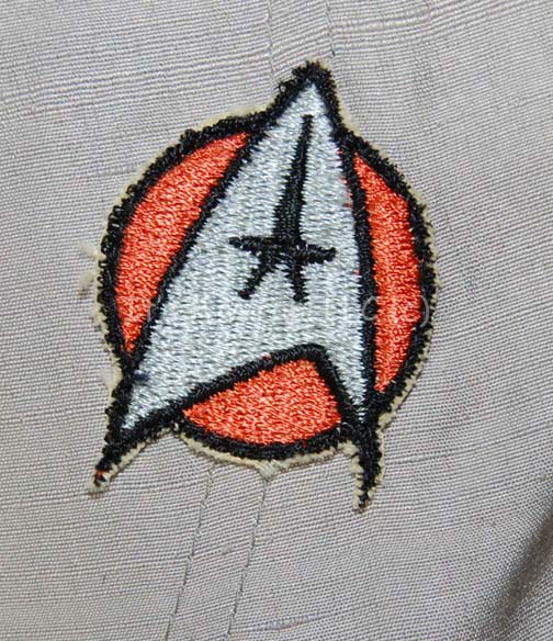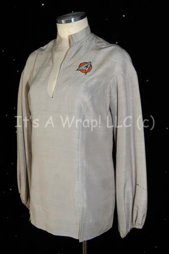 Description: A costume item of the style featured in the first Star Trek feature film. This item is a gray Starfleet uniform shirt featuring a sewn on Starfleet emblem with orange backing denoting the wearer to be a member of the Sciences division. The item has a sewn on Paramount tag that reads merely ‘12’.