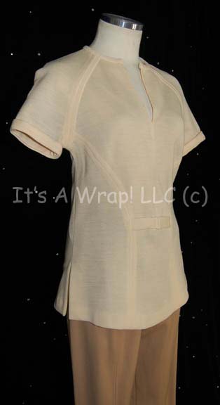 Description: A costume in the style featured in the first Star Trek feature film. This costume consists of a crème-colored Class-B Starfleet uniform shirt featuring an unattached bio-monitor and Science Orange division strips with the speculative rank of Crewman Second Class, and tan trousers.
