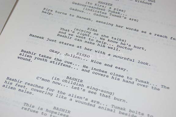 Description: A lot of three scripts from three sequential episodes in the second season of Star Trek: Deep Space Nine. The first script is from “Second Sight”; wherein “Commander Sisko” (Avery Brooks) finds himself falling with a woman who mysteriously disappears every time he sees her again. The second script is from “Sanctuary”; wherein a group of refugees comes through the wormhole looking for their “promised land”. The third script is from the episode “Rivals”; wherein an El-Aurian con-man named “Martus Mazur” (Chris Sarandon) opens up his own bar and almost put “Quark” (Armin Shimerman) out of business. It was originally pitched that “Martus Mazur” be the estranged son of “Guinan” (Whoopi Goldberg) but she wasn’t available at the time. All three items are first drafts and feature the episode name, the date they were written, and a title page with the writer and director. 7373