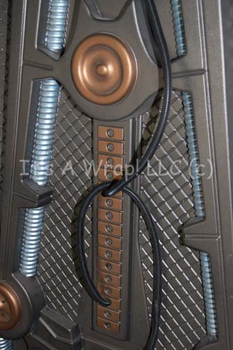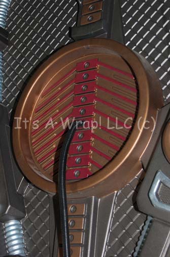 Description: A piece of set dressing similar to those featured in Star Trek feature films and episodic television. This item is the back “wall” piece of one of the Borg alcoves, metallic-pewter vacuform piece of a wood frame featuring metallic-silver colored tubing accents, further metallic-bronze colored accents, a central red area with raised copper-colored stripes where the drone’s head would set and black, plastic tube jutting out from the middle. The item measures approx. 94 X 36 X 3 inches.