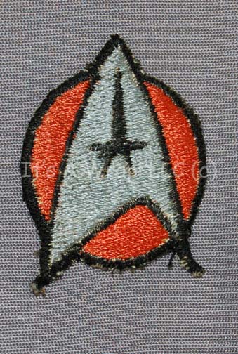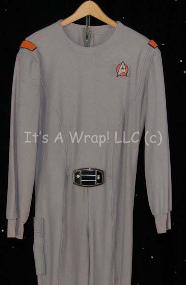 Description: A costume featured in the first Star Trek feature film. This costume is a long-sleeved, full-length, gray, Class-D Starfleet uniform jumpsuit featuring Science division Orange division strips on the shoulders, an orange-backed Starfleet emblem on the left breast, sewn on shoes, and an attached bio-monitor with brown colored plastic, black adhered label and metallic silver colored details to suggest technology. The costume is for male wearers and has a zip down the back with clasps at the neck. Item Numbr 7391