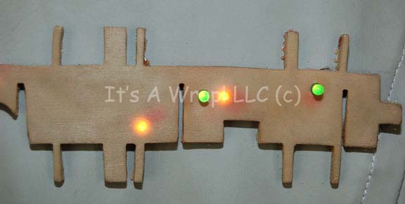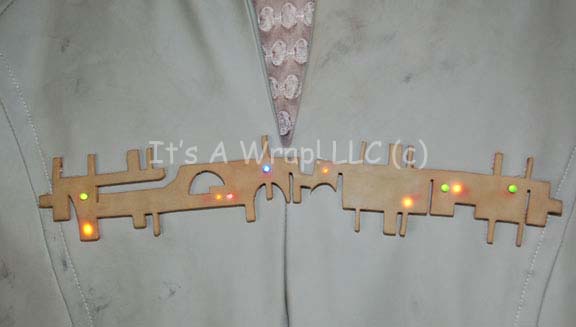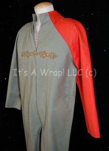 Description: A costume featured in the Star Trek: Voyager episode “Repentance”; wherein “Voyager” comes to the rescue of a critically damaged prison ship but, the more they learn, the more they begin to doubt the system that incarcerated the inmates. This costume consist of an olive-colored, sleeveless, mesh shirt featuring a textured, circular pattern, an olive, vinyl jumpsuit with orange down one arm, plastic iconographic symbols across the abdomen, working, built-in LED lights, a zip down the back, and a black, elastic belt that holds the battery and the activation switch for the LED strapped into it. This item is a stunt version so is distressed for effect, has a sewn in tag in the jumpsuit reads ‘Mark Raccardi’, a sewn in Voyager tag on the belt reads the same, and a costumer’s tag reads ‘259 Repentance, Iko Stunt Dbl, Mark Raccardi’.