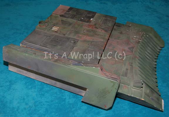 Description: A model component believed to have been created for close-up shots of a starship. The item is believed to be part of the Reman Warbird Scimitar from Star Trek X: Nemesis. The item is composed of wood slats adhered together with molded resin exteriors affixed. The exteriors are high detail with green paint and brown hues to create an exposed-to-space appearance. The item measures approx. 21.5 X 16 X 5 inches.
