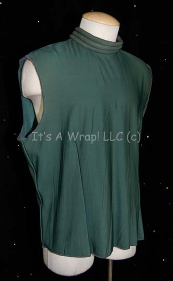 Description: A costume shirt located in the Star Trek feature films collection believed to be an alternative to costume dickies frequently associated to Class-C Starfleet uniforms seen in Star Trek I: The Motion Picture. In later features like Star Trek IV: The Voyage Home the costumes were altered and re-colored to appear as Federation Security Council ushers where it is believed costume shirts like these were worn underneath. The item is a sleeveless green shirt with a zip spine and a horizontally ribbed collar with a sewn in Paramount tag reading ‘size 42’ intended for a male wearer.