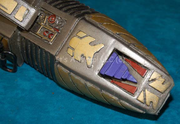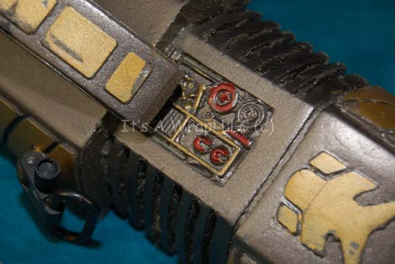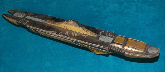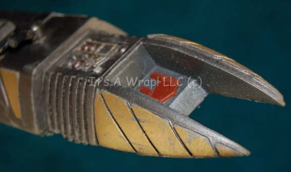 Description: A prop item featured extensively in Star Trek: Deep Space Nine but also made numerous appearances in Star Trek: The Next Generation and Voyager. This prop disruptor is made of sturdy foam rubber; the base color is gun-metal grey with gold and red, raised accents in addition to multi-colored, textured details meant to denote circuitry, and two metal rings to attach a carry strap. Due to time and use the paint has flaked in places, both handles are detached but are whole and can be glued back. The item measures approx. 21.5 x 8 x 3.5 inches.