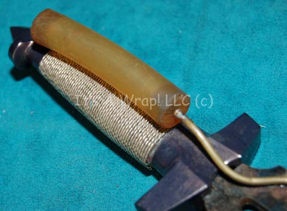 Description: A prop knife featured in tenth Star Trek X feature film, “Nemesis”, for use by Tom Hardy in his portrayal of “Shinzon” during a scene taking place aboard the Reman Warbird “Scimitar” wherein he cuts his hand to allow for the “Enterprise-E” crew to take a sample of his blood for testing. The item is metal with a metal wire wrapped grip painted with a multi-color petroleum sheen on the ‘blade' which is beveled to appear sharp. This item is unique in that it features an additional element; a metal tube affixed to the backside of one blade which is attached to a rubber tube at the grip. The purpose being that special effects ‘blood’ squirt from the blade as the ‘cutting’ action occurs on screen. In fact, evidence of special effects ‘blood’ still exists on the ‘blade’. The item measures approx. 9.5 X 1.5 X 2 inches.