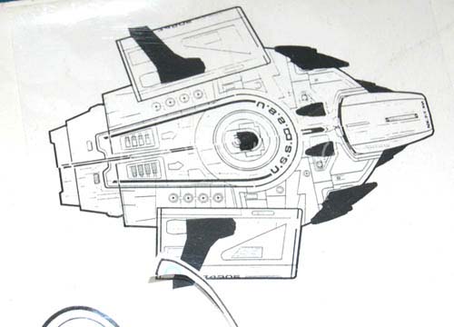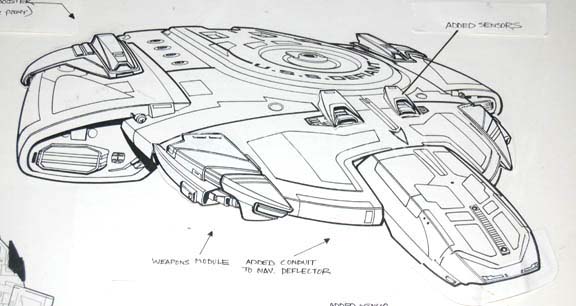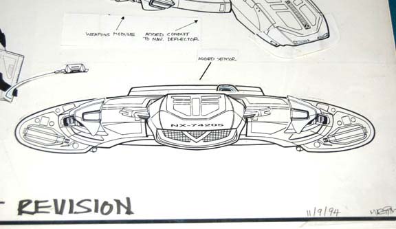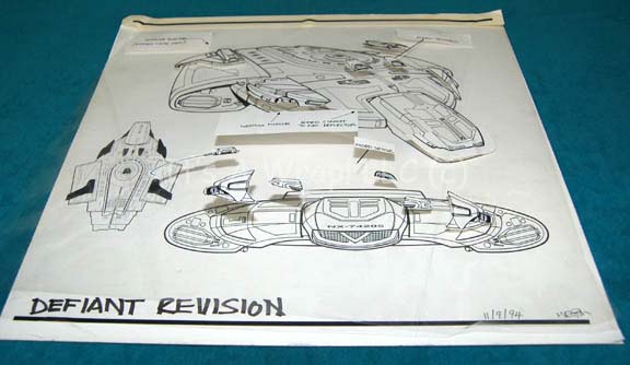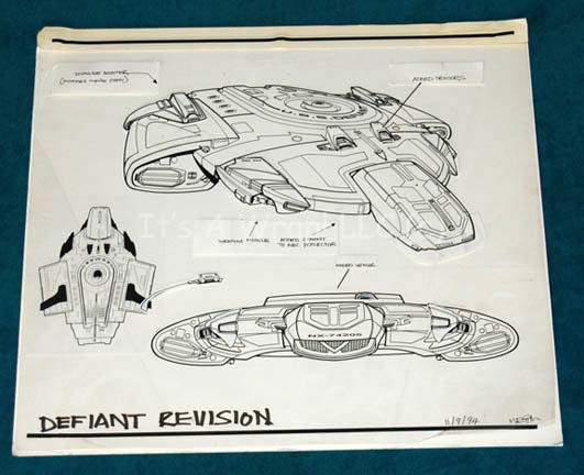 Description: A piece of production art created to depict revisions to the “USS Defiant” model during Star Trek: Deep Space Nine. The item is a poster-board sheet with a paper copy of the fore, dorsal, and a positioned view of said ship. The item also features a clear Mylar sheet with adhered paper accents depicting suggested technological improvements to the exterior of the craft. The improvements are labeled ‘Impulse Booster’, ‘Added Sensors’, and ‘Weapons Module’. The item is labeled ‘Defiant Revision, 11/24/94’ and signed ‘Martin’. The item measures approx. 14.5 X 16 inches.