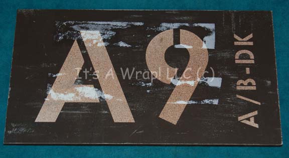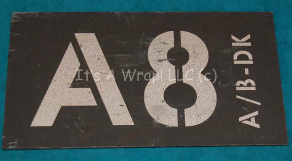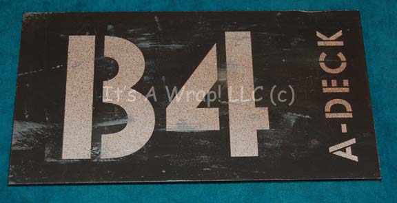 Description: A set of three door signage elements featured in the Star Trek: Enterprise episode “Horizon”. The items are sheet plastic with graphical applications adhered to their faces. The graphics depict letter and number locations for shipboard duty. Two of the items feature unused double sided adhesive for reapplication to set pieces, one depicts a degree of damage as the graphic is visibly discolored from removal of something adhesive. The items are distressed to appear ‘worn’ and measure approx. 8.75 X 5 inches each.