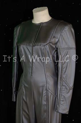 Description: A costume featured in the Star Trek: Voyager episode “Alice”; wherein “Tom Paris” (Robert Duncan McNeill) rescues a ‘haunted’ shuttle with a neurogenic interface that slowly begins to take over his mind. This costume consists of s a sleeveless, gray undershirt in a stretchy, spandex-like material, a long-sleeved, full-length, metallic gray, vinyl jumpsuit featuring raised trim down the front and back, loosely around the collar, and down the arms. A sewn in Voyager tag reads ‘Claire Rankin’ and a costumer’s tag reads ‘Voyager 226 Alice, Alice, Claire Rankin’.