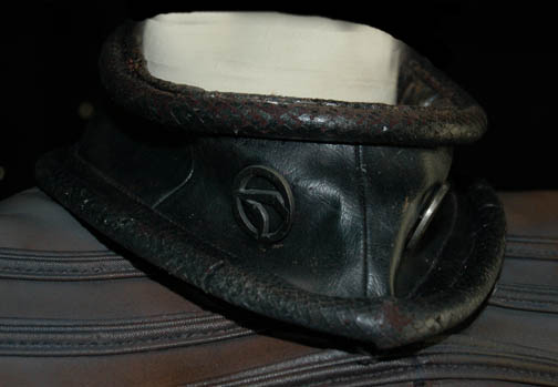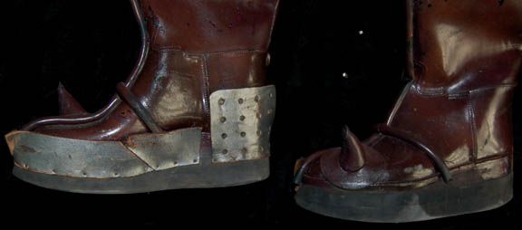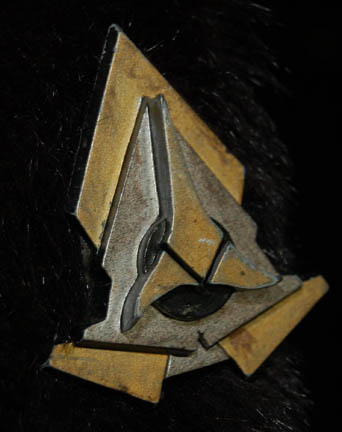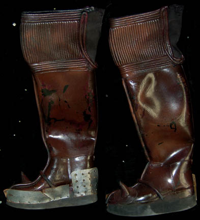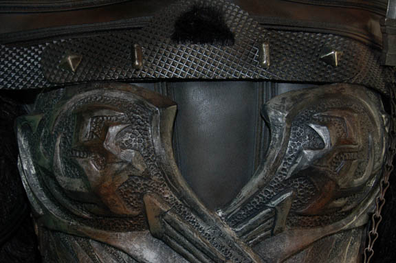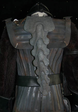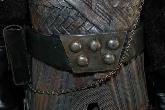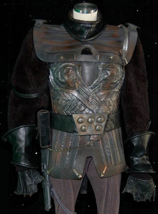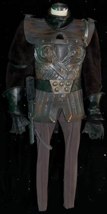 Description: A costume similar to those featured Star Trek: Voyager and Deep Space Nine. Almost every garment of this costume has a label in it that reads “Grace Harrell” and is the last 24th century female Klingon costume thus far located; it is mauve-colored, overall-style leggings with stirrups for the feet, black leather gauntlets, a gorget with Klingon sigil pins on either side of the next, black leather, fingerless gloves with “claws” inserted, a gray leather D’k tahg scabbard with knife, a black leather belt featuring a metal trapezoidal buckle with five raised dots on it and a black, leather snap case. A gray, leather/vinyl jacket featuring black, faux fur along the sleeves, a heavily engraved and decorated, fiberglass breastplate, textured plastic accents down from the shoulders and across the chest, horizontal stripes above them, more faux fur and metal studs just above the breastplate; similar stripes and plastic accents under the breastplate, a foam spine on the back, random clasp chain, Klingon sigil on the left arm, knee-length, red-brown rubber boots with vertical, textured, stripes along the top and spikes on the toes. Almost every aspect of the costume is somehow labeled with the name “Grace Hurrell”.