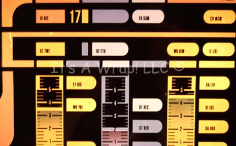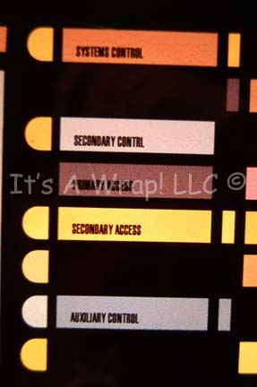 Description: An LCARS style (Library Computer Access and Retrieval System) computer console interface created for 24th century era Star Trek episodic television. The item is a mid-sized sheet of smoked acrylic with rounded edges meant to be fitted in to console insets and back lit to reveal the multi-colored graphical application adhered to the reverse. The graphic depicts an attitude or pitch dial and a series of static gages, indicators, and faux buttons, many of which are labeled with alphabetical values. The values represented include ‘Emergency Override’, ‘Red Alert’, ‘LCARS Mode Select’, and several others. The item measures approx. 32.75 X 10.75 inches and the graphic depicts only slight scratches; the item is in good overall condition.